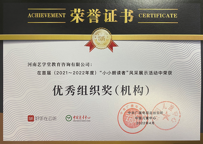 業內認可,載譽前行。合肥、鄭州、南昌、成都、濟南5大城市校區同步聯動,開展曹燦杯青少年朗誦展示活動、熱舞吧·少年街舞大賽、花漾星主播語言藝術大賽、電視臺少兒六一晚會等活動,獲得社會與家長認可,榮獲中央廣播電視臺頒發優秀組織獎,中國美術學院頒發教學示范基地優秀教學基地,市監管局頒發放心消費示范單位等稱號。
