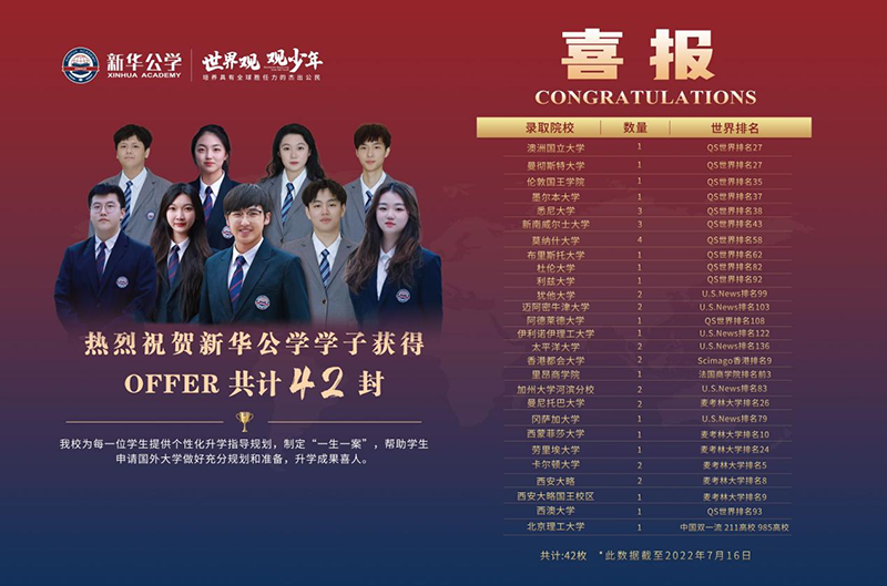 新華學子捷報頻傳、教學成果碩果累累。新華公學首屆12年級畢業生共收獲42封世界名校offer,其中包含世界Top50海外名校以及國內雙一流名校。用新華學子的實際成績,向支持認可新華公學的家長和社會各界交出了一張滿意的答卷。
