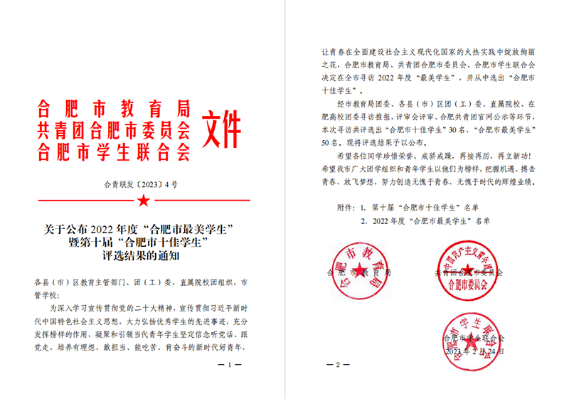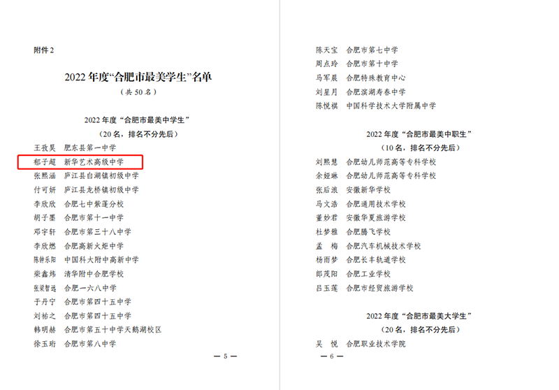 為深入學習宣傳貫徹黨的二十大精神,宣傳貫徹習近平新時代中國特色社會主義思想,大力弘揚優秀學生的先進事跡,充分發揮榜樣的作用,近日,由合肥市教育局、共青團合肥市委員會、合肥市學生聯合會聯合開展的2022 年度“合肥市最美學生” 暨第十屆“合肥市十佳學生” 評選結果出爐。我校高二(1)班郁子超同學獲評“合肥市最美中學生”稱號