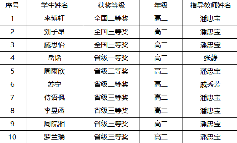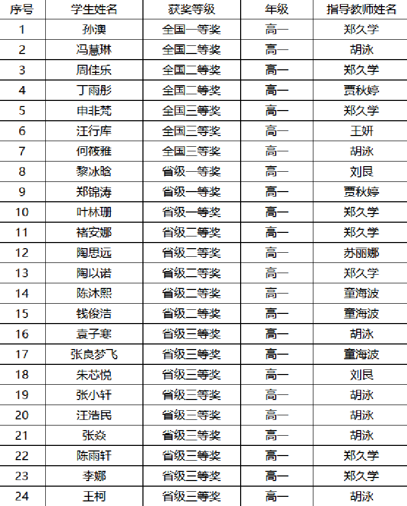 其中,高一年級(jí)孫澳同學(xué)獲得全國一等獎(jiǎng);高一年級(jí)馮慧琳、周佳樂、丁雨彤及高二年級(jí)李博軒等4位同學(xué)獲得全國二等獎(jiǎng);高一年級(jí)申非梵、汪行庫、何筱雅及高二年級(jí)劉子昂、戚思怡等5位同學(xué)獲得全國三等獎(jiǎng)。另有24位同學(xué)獲得省級(jí)一等獎(jiǎng)、二等獎(jiǎng)、三等獎(jiǎng)。