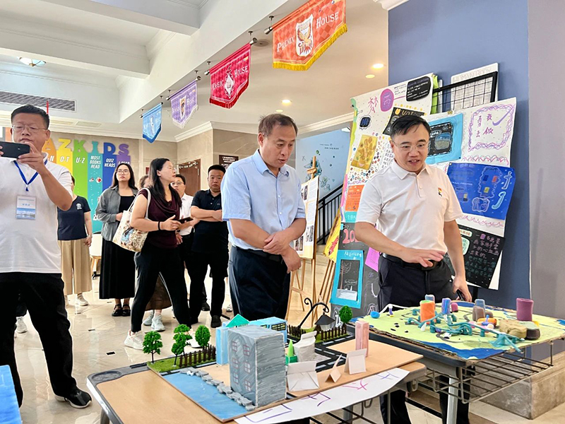 在融合部大廳,考察團駐足觀看了學生制作的IB-MYP學科探索展,并與校領導、教師代表親切交談,陳振祿詳細詢問了跨文化學科教研情況。當了解到學校已引進二十余名外籍專家時,他表示:“新華公學優(yōu)良的國際化師資隊伍是培養(yǎng)全球化人才的重要保障。”