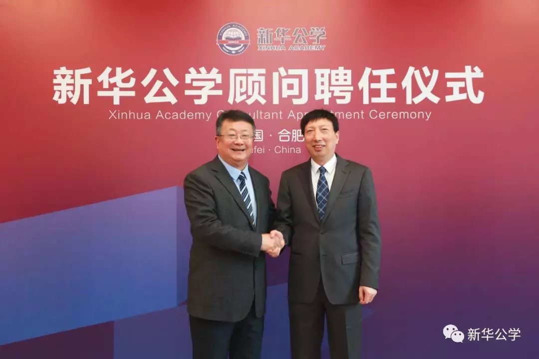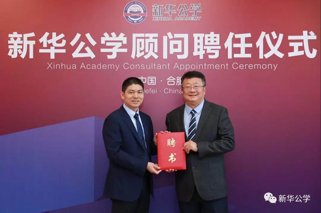 4月30日上午,新華公學總顧問聘任儀式在校會議大廳隆重舉行。新華公學正式聘任安徽省人民政府參事、合肥一中原校長陳棟先生為新華公學總顧問。新華控股集團董事長吳成柱、新華控股集團執行董事白寧、新華控股集團副總裁董超、新華公學總校長李建民等領導出席儀式。
