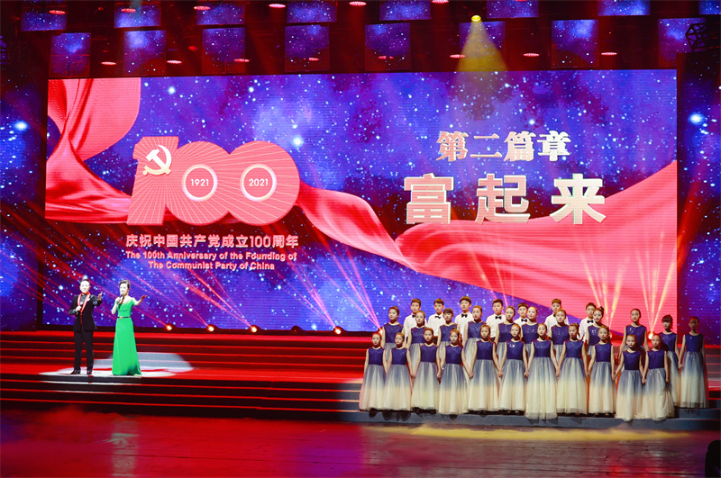 新華公學童聲合唱團完美的用哼鳴式演唱法為晚會三個篇章開場,用歌聲向中國共產黨百年華誕獻禮,用微笑和行動表明作為社會主義接班人的決心:“童心向黨,堅決跟黨走,聽從黨的指揮”。