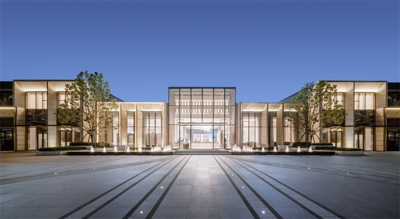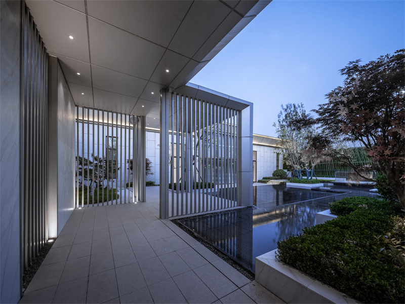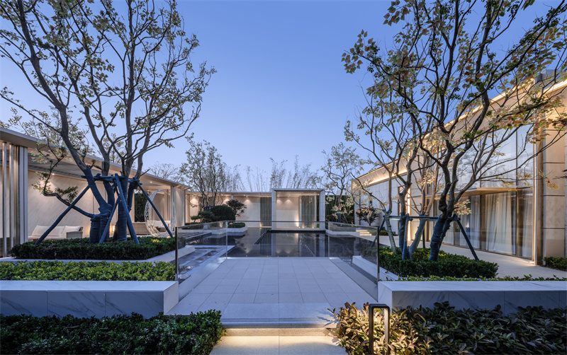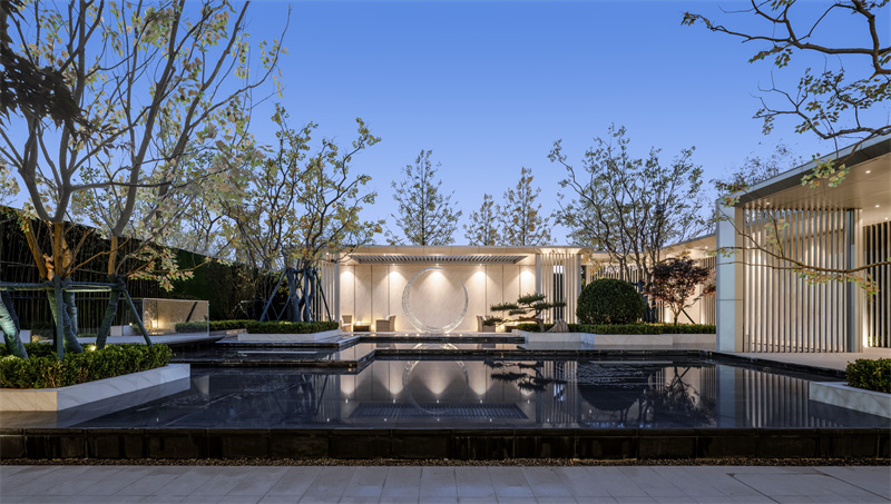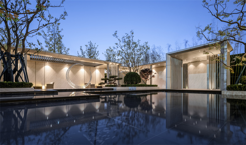 前場精細的鋪裝排版,黑灰間隔,配上灑脫跳躍的航道燈。使之與售樓處內(nèi)燈火遙相呼應(yīng),呈現(xiàn)出一片高貴典雅的氣質(zhì),仿佛在訴說著屬于拾光里的故事。