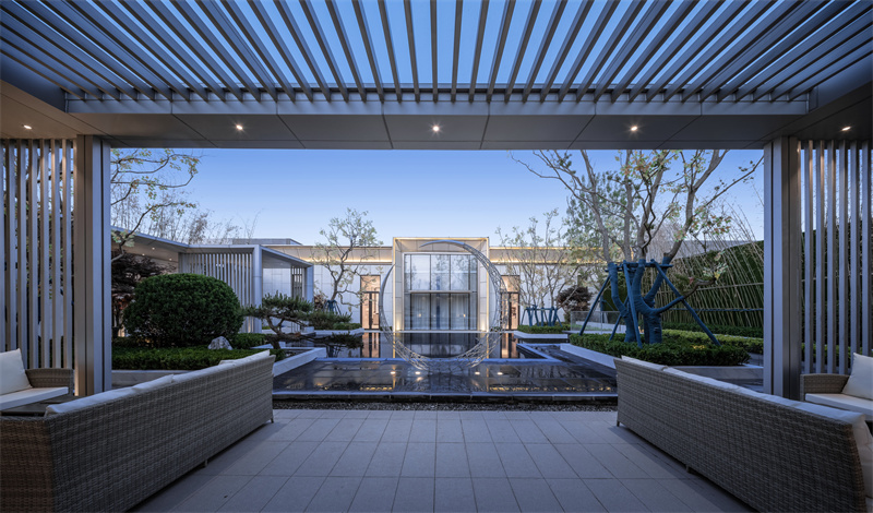 灰色廊架、斜飄古松倒映在鏡面水景。雄偉的銀杏、優(yōu)雅的烏柏桕,嚴肅而不失溫馨。正所謂月掛梢頭,天上人間。