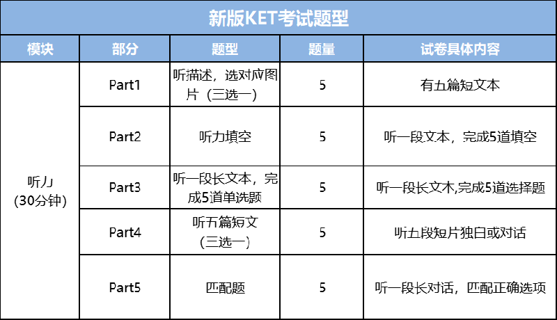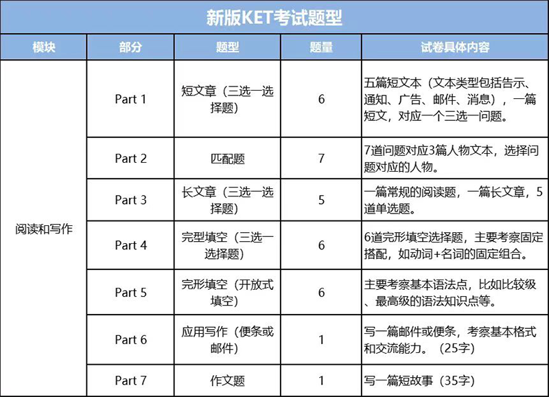 我們?cè)賮?lái)看看KET考試概況,KET主要考察四大方面,聽、說(shuō)、讀、寫四大部分,每一部分的題量和分值如下:
