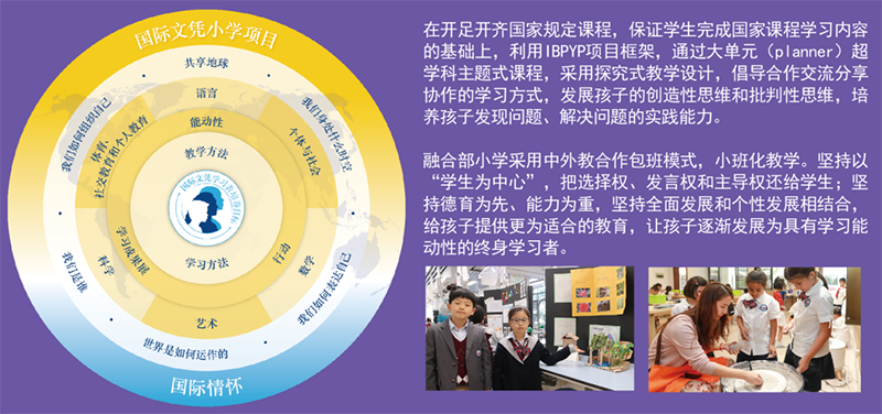 小學課程與教學活動圍繞興趣培養、學習技能及思維方式進行編排;各學科中外教師共同備課,幫助學生建立廣泛的知識關聯;設置多學科融合探究,提升學科素養;分層教學模式及項目式合作學習,針對性提高學生的學術水平;鼓勵學生參與實踐活動,提高學生獨立思考與合作創新能力。